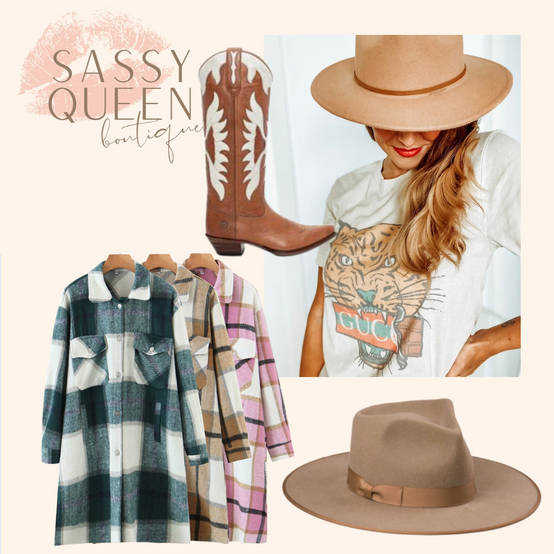 What babe doesn't love a good hat? Felt hats are in! Pair your favorite Sassy Queen Tee with a felt hat and a pair of cowgirl boots. You will be right with what is trending for Fall 2021. You could even take it one step farther and do a pair of bell bottoms and a fringe bag. Go all in and make the statement!